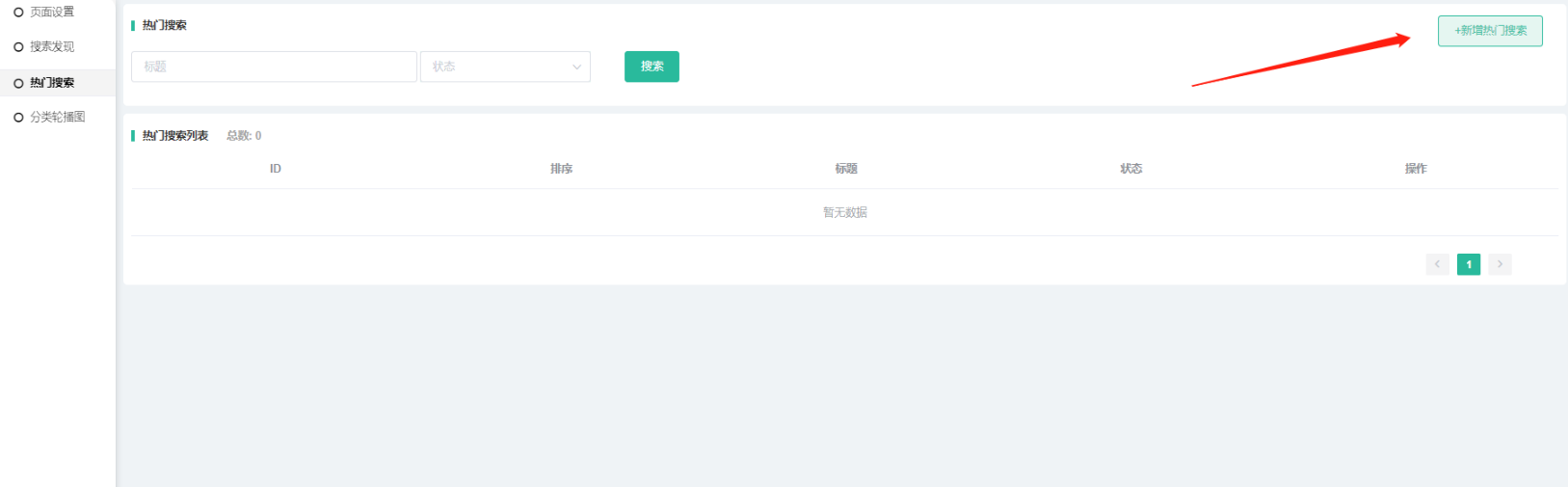 1、添加热门搜索,设置排序(数字大靠前显示;排序数字一样创建ID小靠前显示)、标题、副标题、图标、小程序链接,是否开启。